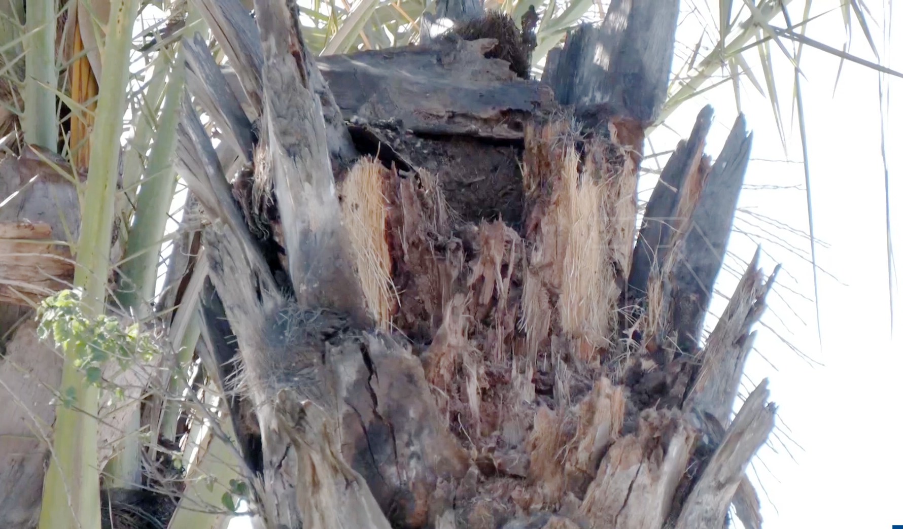 Bien qu’appartenant au même genre que le palmier des Canaries, les palmiers dattiers ont une architecture différente. Ce sont des palmiers cespiteux qui peuvent produire des rejets (ils sont d’ailleurs recherchés pour réaliser des massifs remarquables). Les rejets, constitués de tissus tendres sont des sites de pontes pour les femelles qui pourront y déposer leurs œufs. Ce sont donc aussi des portes d’entrée pour le CRP. Chez les dattiers infestés à partir des rejets, il se produit assez souvent un dessèchement progressif des palmes rendant la détection précoce assez facile…à condition de savoir où regarder.