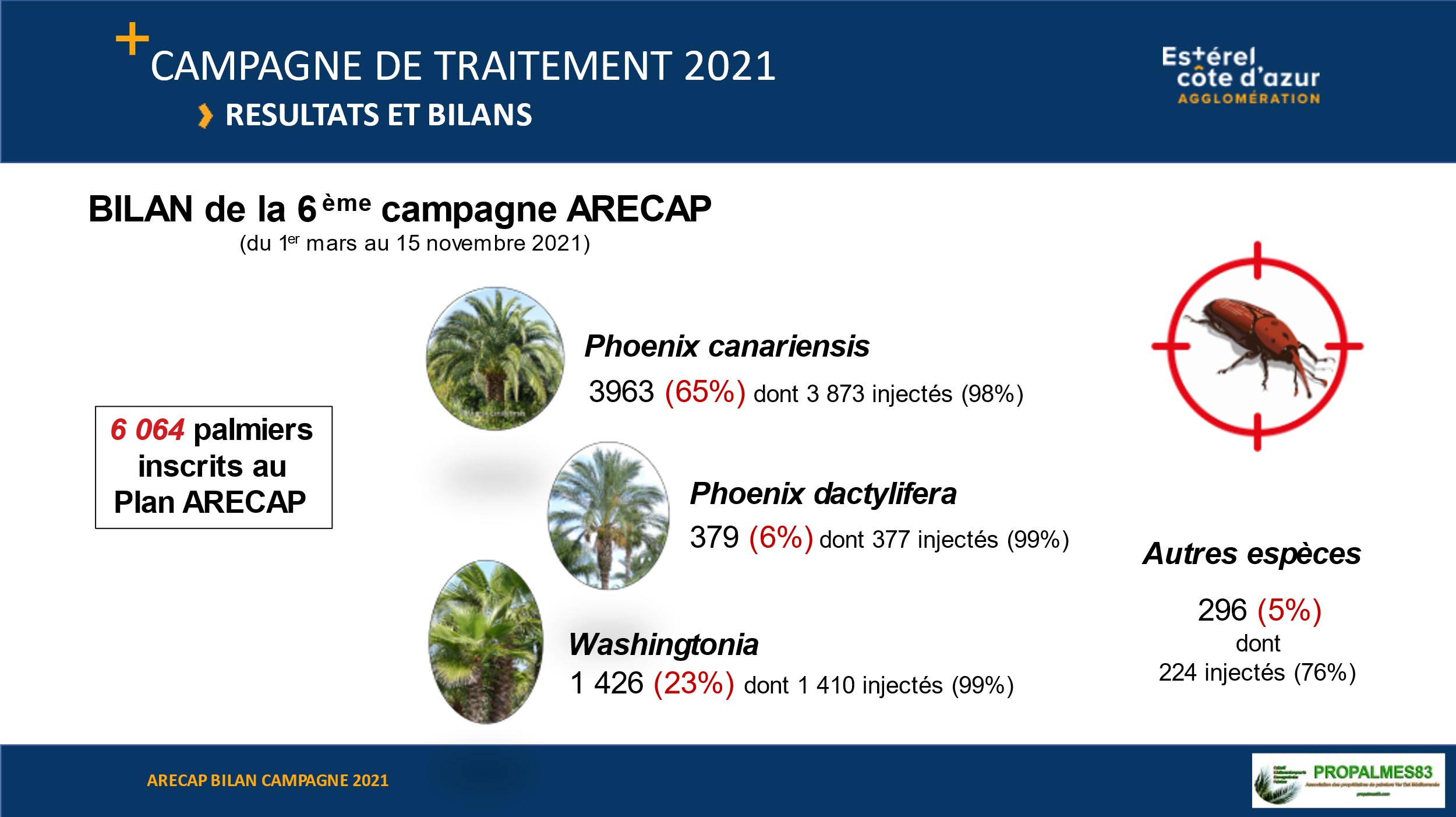 Plus de 2100 propriétaires se sont impliqués dans le lutte. Au total 6064 palmiers dont 90 % de palmiers privés, inscrits à ARECAP en 2021, ont été visités par les applicateurs.